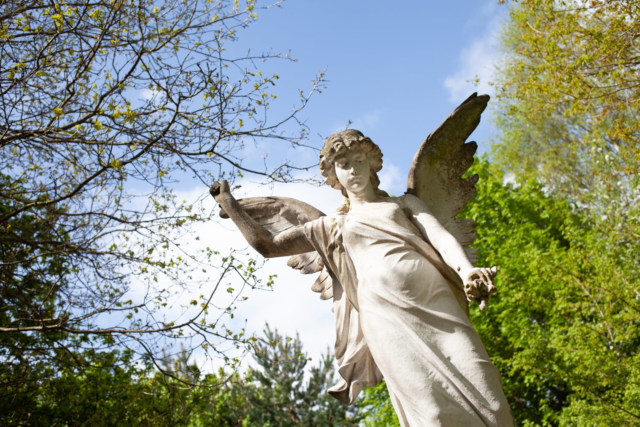 Alternative Text: Angel statue with trees in the background