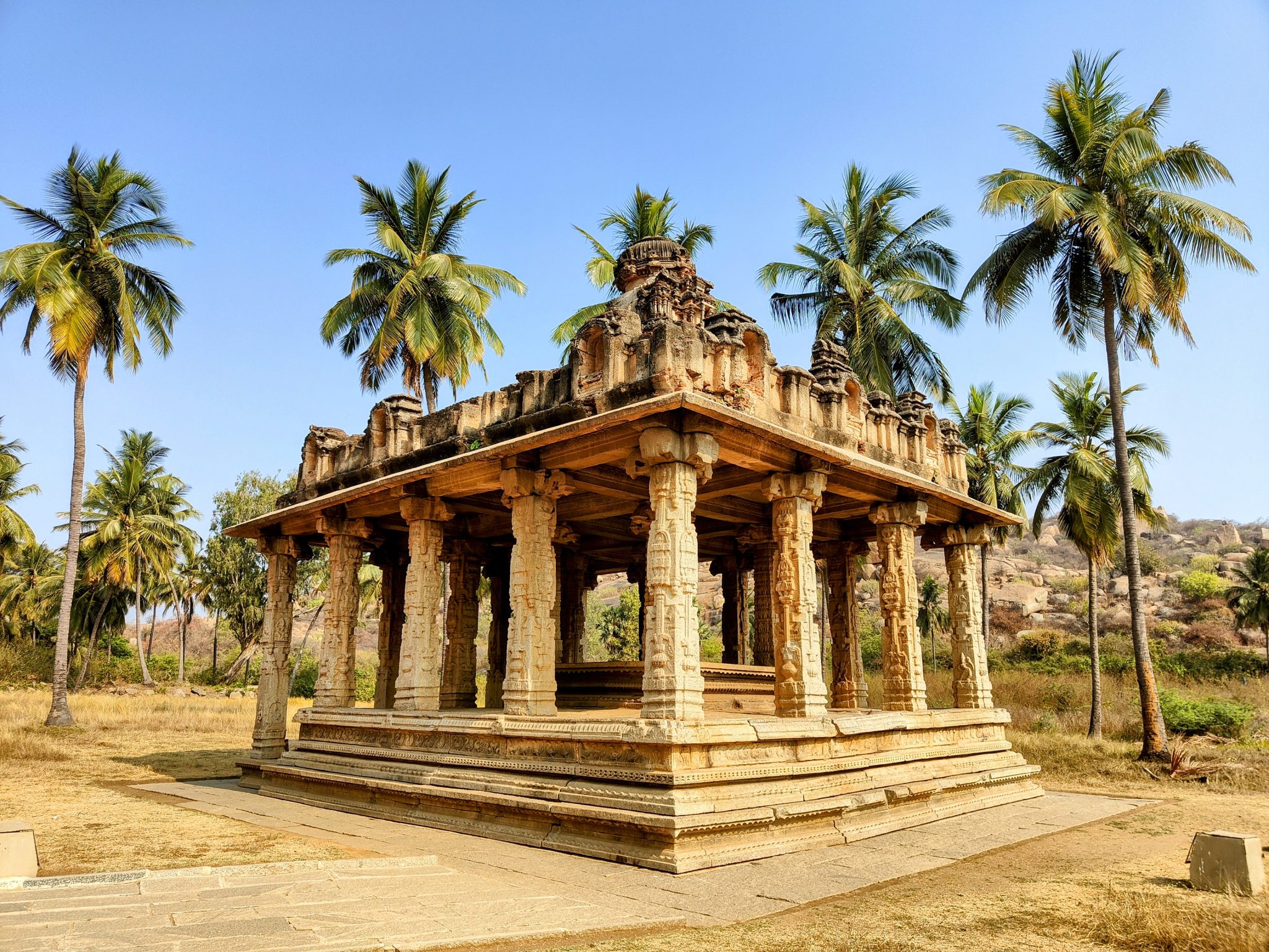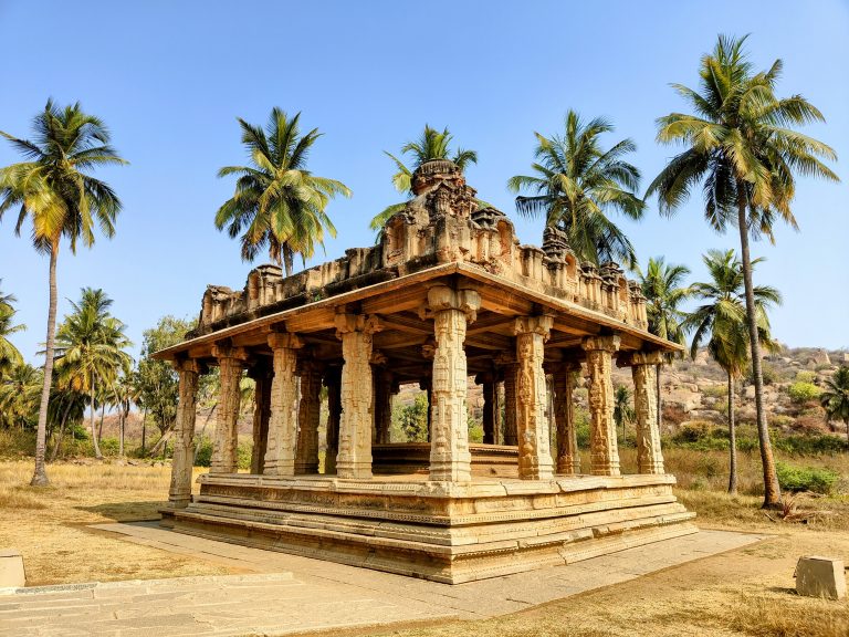 Alternative Text: A beautifully carved stone pavilion in Hampi, known as a mandapa.