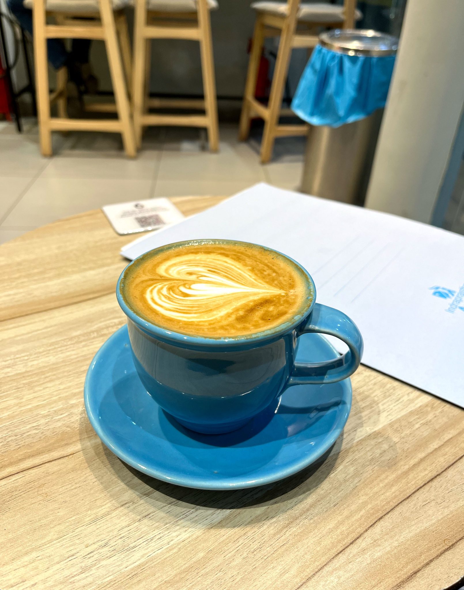 Alternative Text: A blue ceramic cup filled with latte art sits on a matching blue saucer, resting on a wooden table.