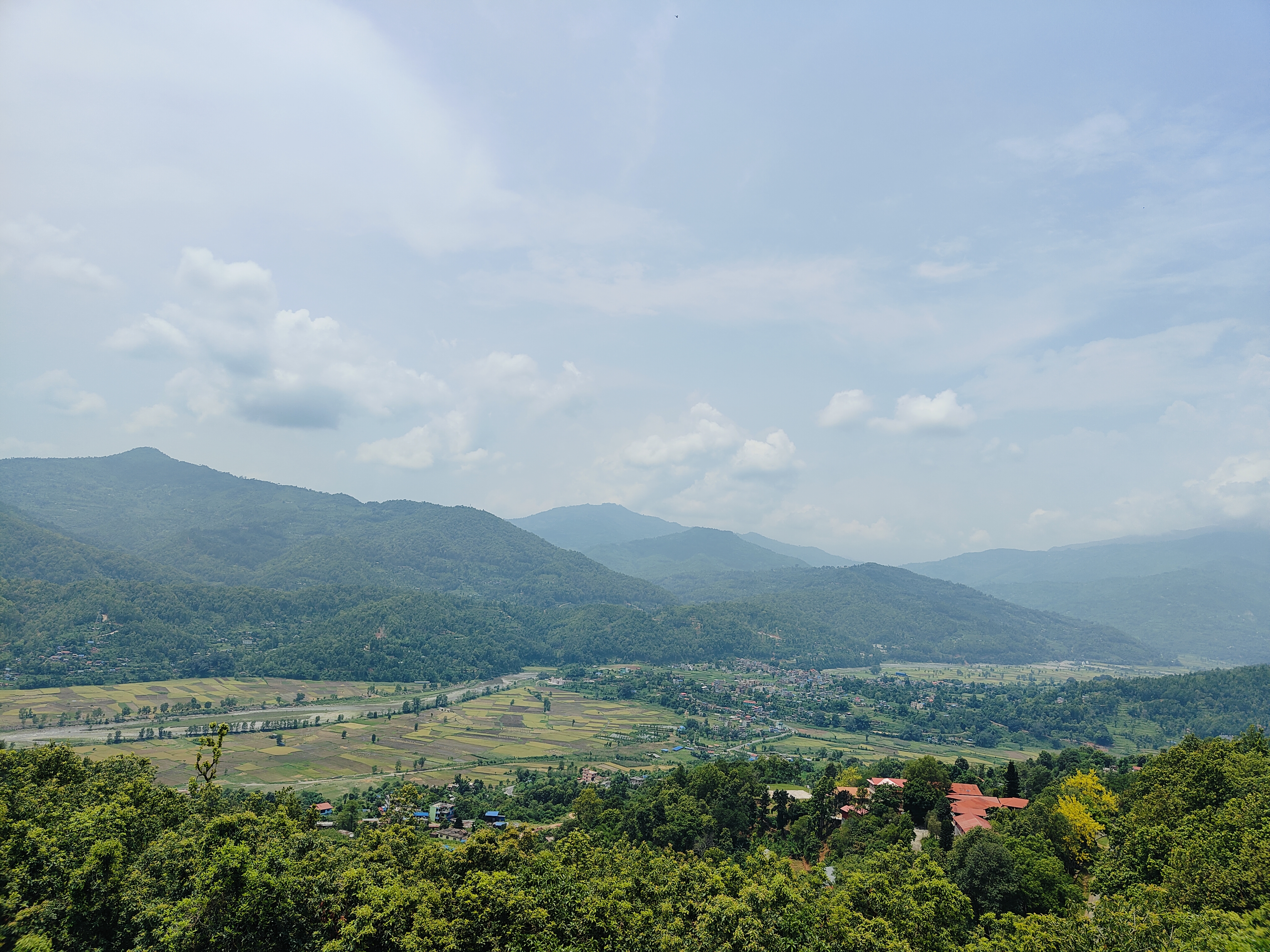 Alternative Text: A panoramic view of lush green mountains under a light blue sky, with scattered fluffy clouds.