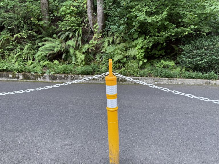 Alternative Text: A yellow reflective bollard with a plastic chain blocks vehicle access to a pathway, surrounded by lush green ferns and trees. Captured near the entrance of the Japanese Garden, Portland.