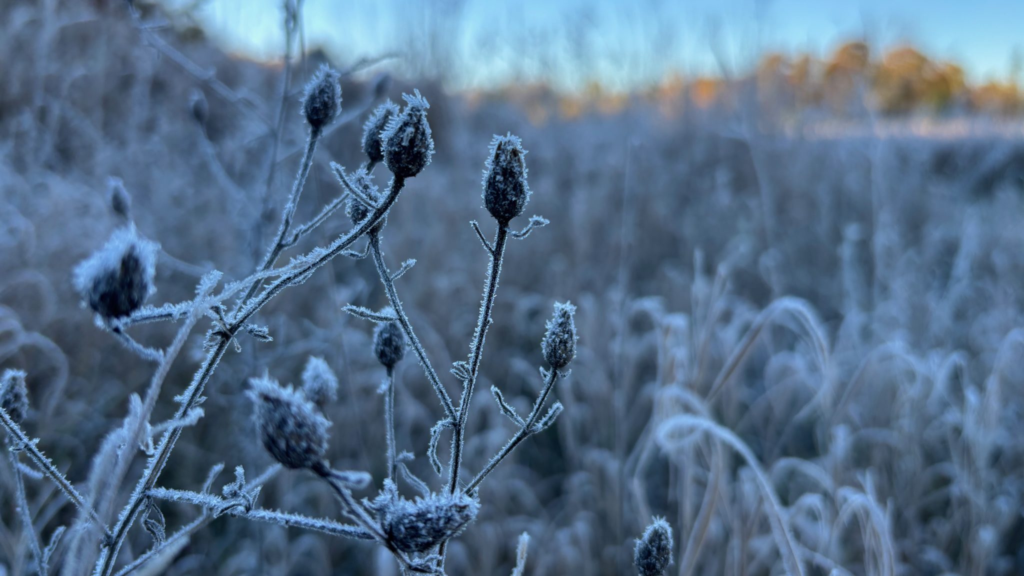Alternative Text: Closeup of after-season thistles encrusted in frost in the early morning.