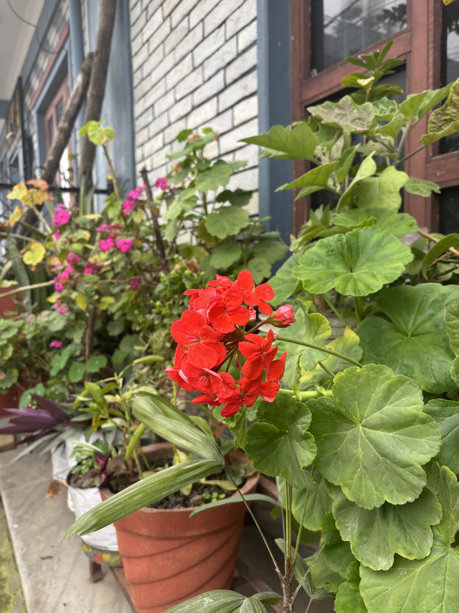 Alternative Text: A close-up view of vibrant red geranium flowers surrounded by lush green leaves in various pots.