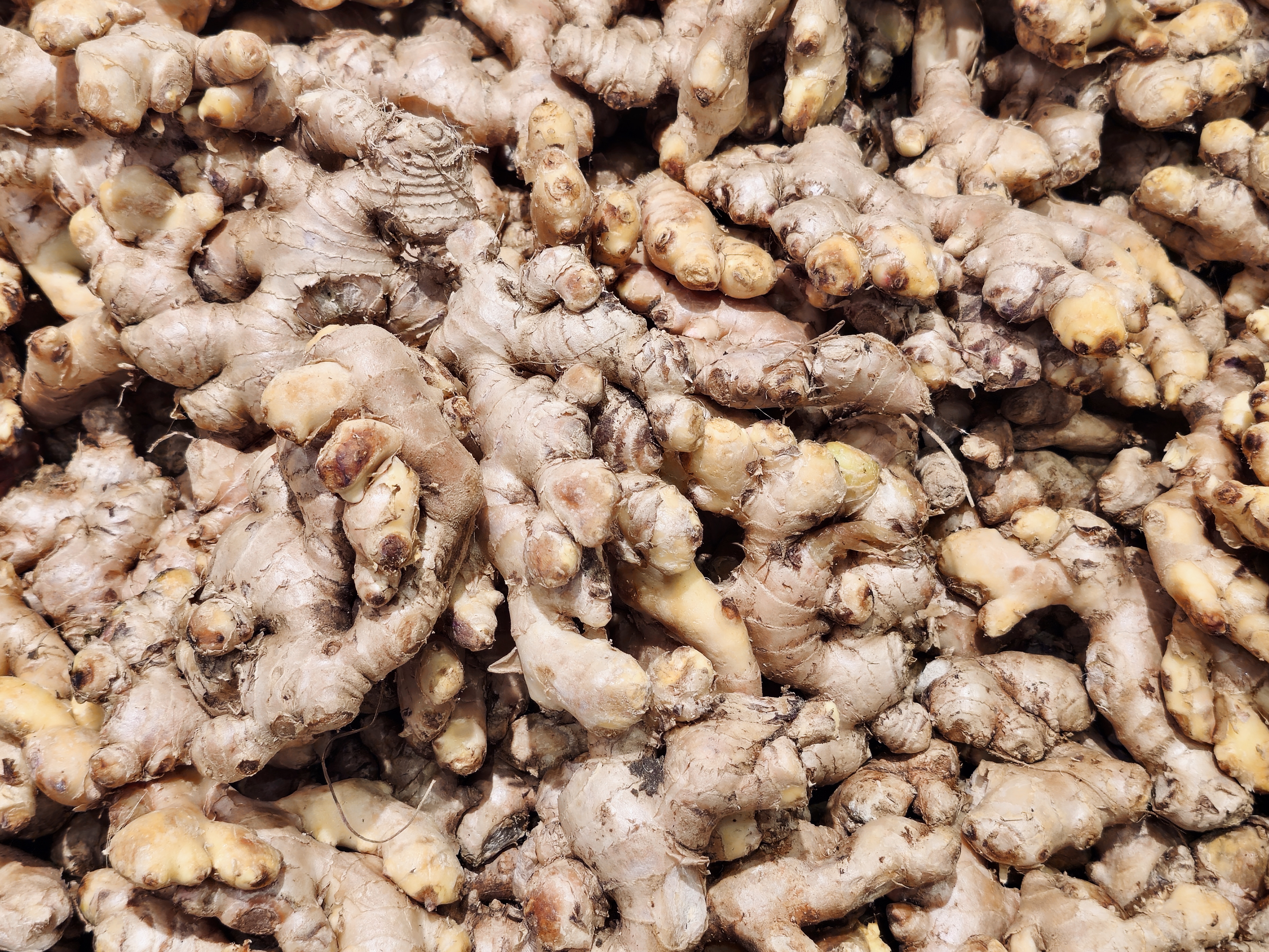 Alternative Text: Fresh ginger roots piled together in the hypermarket in Kozhikode, Kerala. The rough texture and warm brown color show their natural, farm-fresh look and strong aroma.