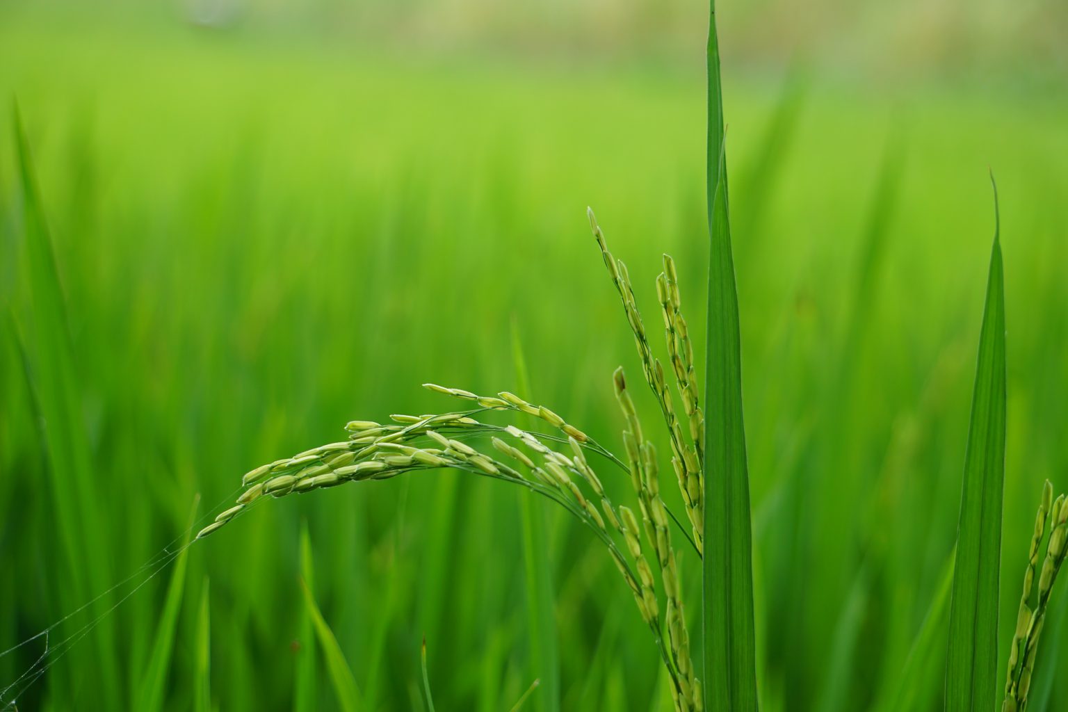 Alternative Text: A close-up of a rice plant featuring a green ear of rice with tiny grains, set against a blurred background of lush green rice paddies.