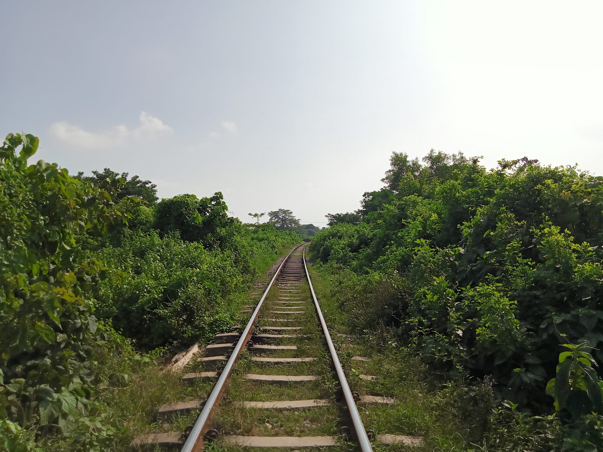 Alternative Text: A view of a set of railway tracks extending into the distance, flanked by lush green vegetation on both sides.