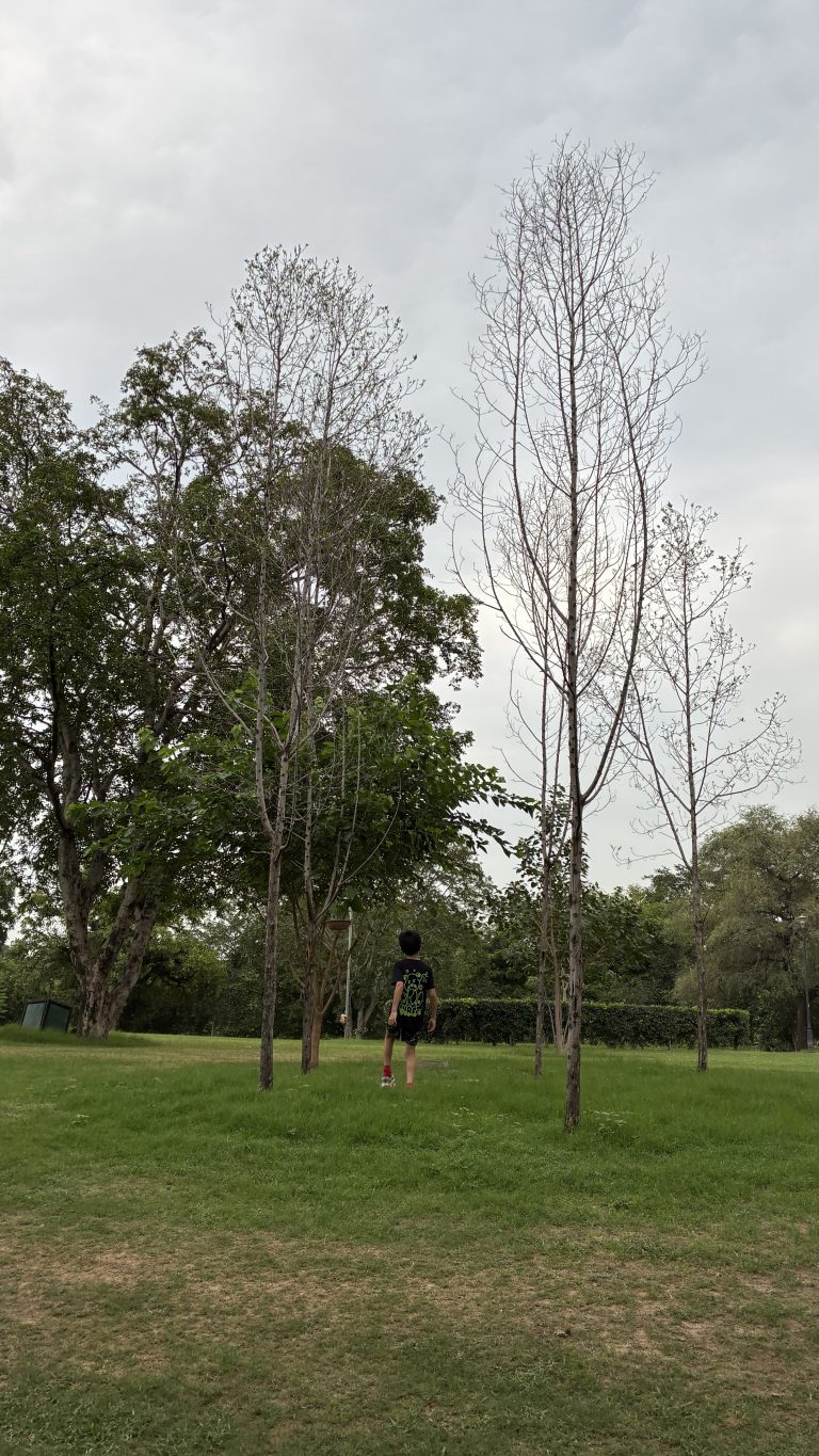 Alternative Text: A boy stands in Central Park, Jaipur, surrounded by tall trees and green grass under a cloudy sky.