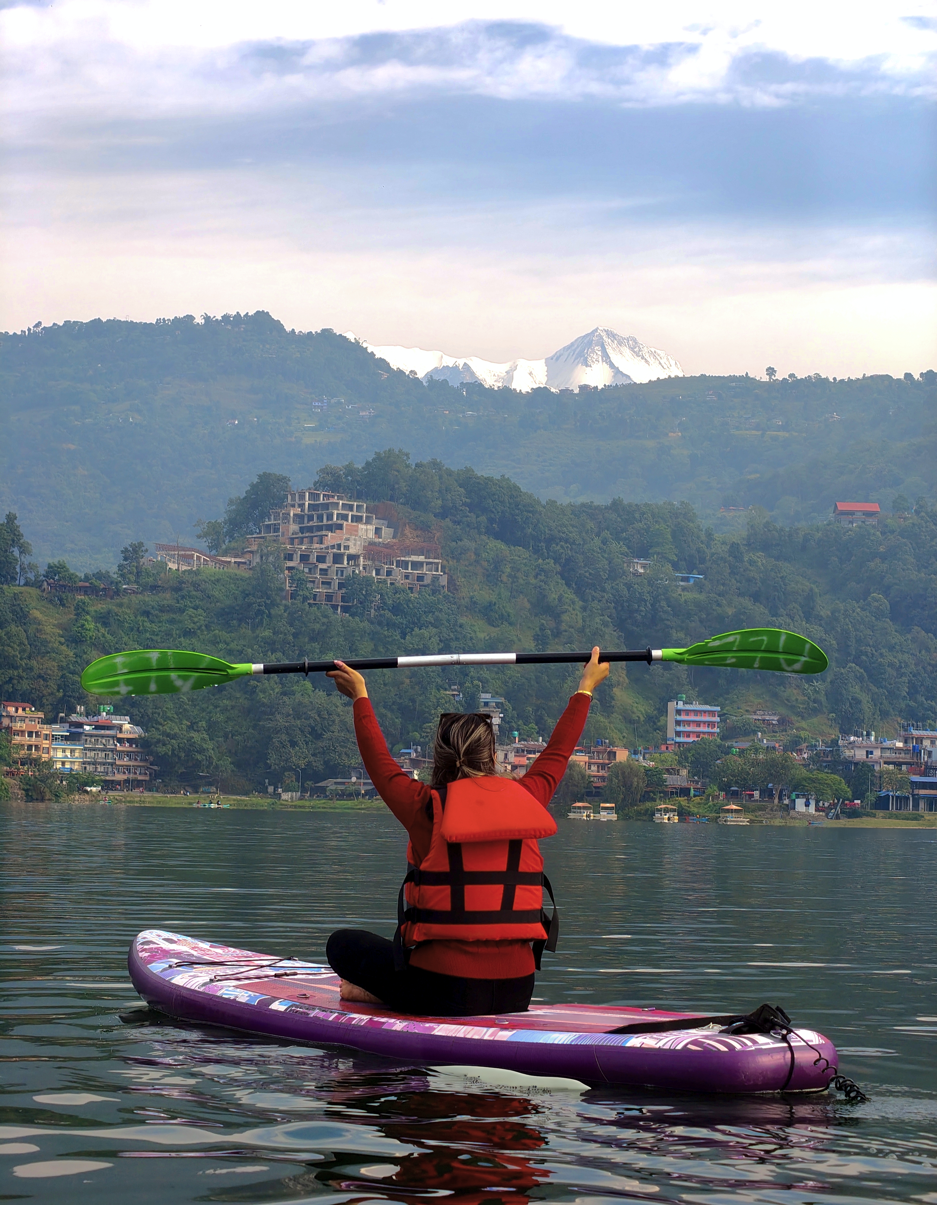 Alternative Text: A person sitting on a purple stand-up paddleboard is paddling on a calm lake.
