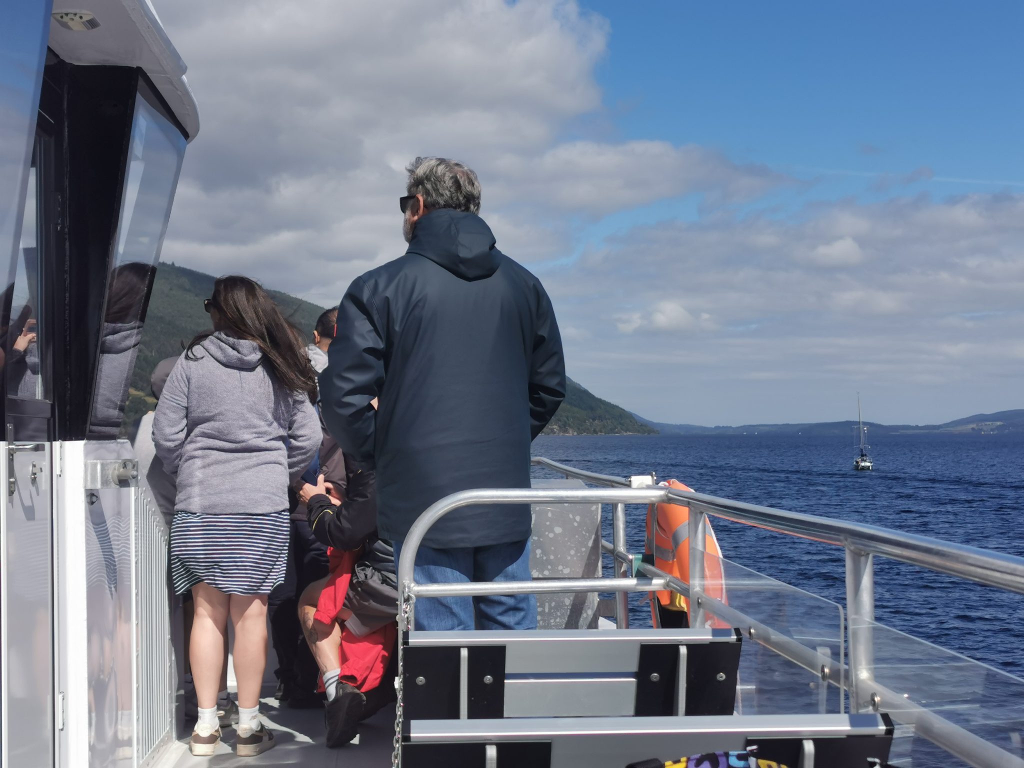 Alternative Text: A group of people standing on the deck of a boat, facing towards a scenic view of water and green hills in the background.