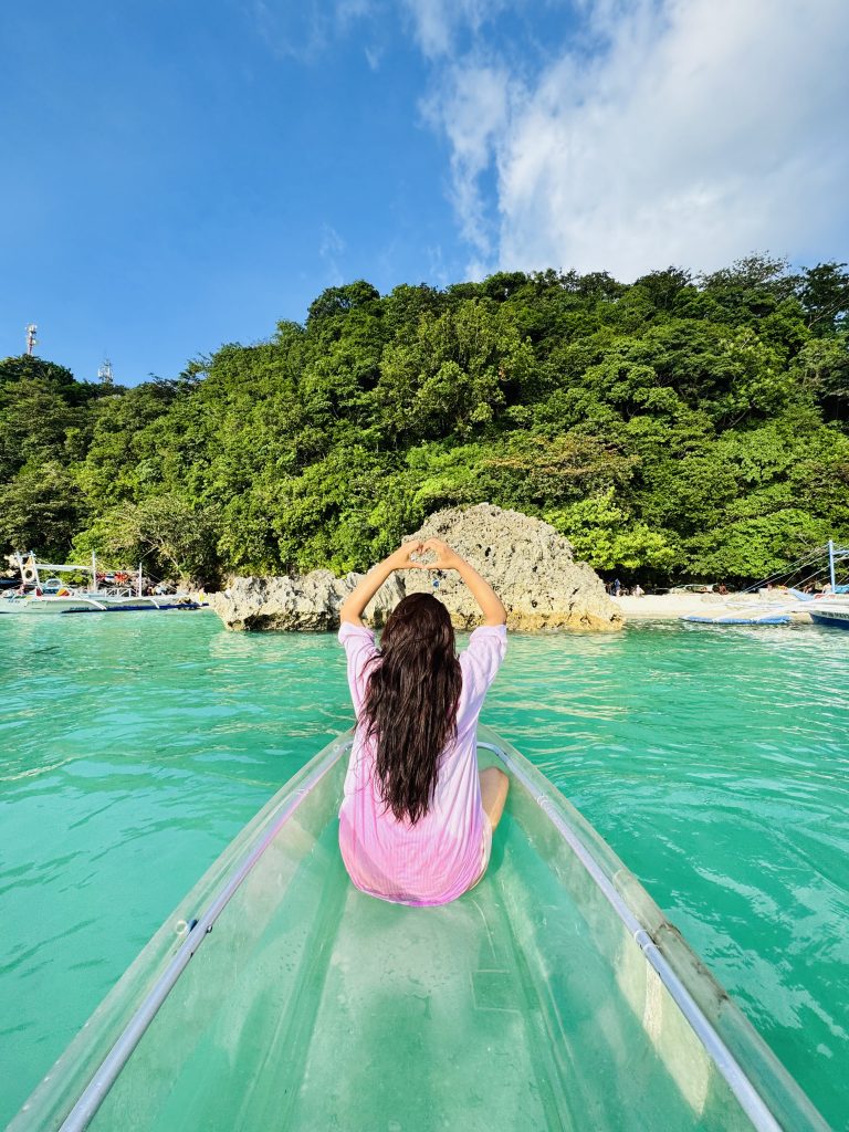 Alternative Text: A woman with long dark hair sits in a transparent kayak on bright turquoise water, facing a lush green, rocky island under a blue sky.