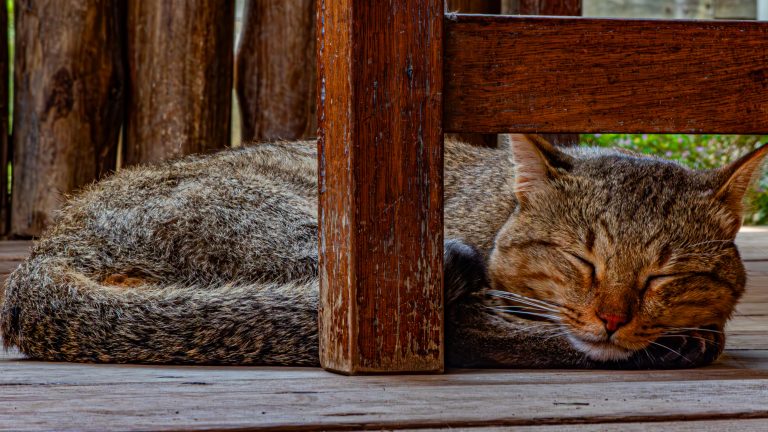 Alternative Text: A tabby cat sleeps peacefully on a wooden deck, nestled under a wooden chair with its head resting on its paws. The background features a rustic wooden fence and blurred greenery.