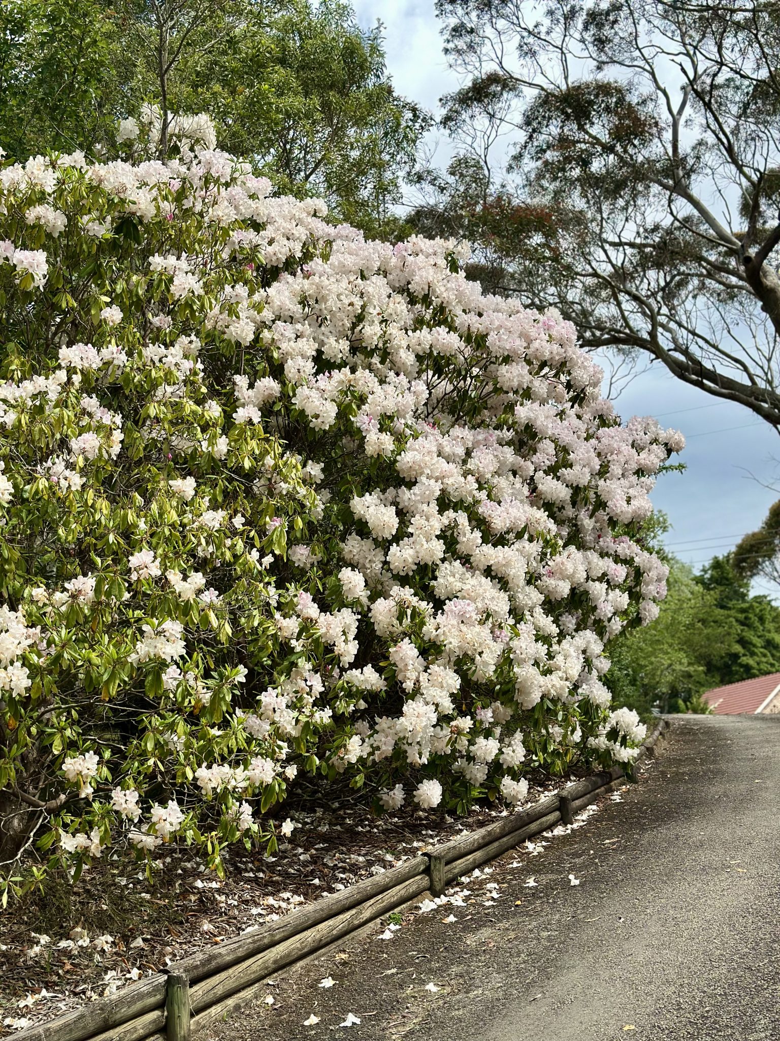 Alternative Text: a picture-perfect white rhododendron blooming one fine spring in Sydney!