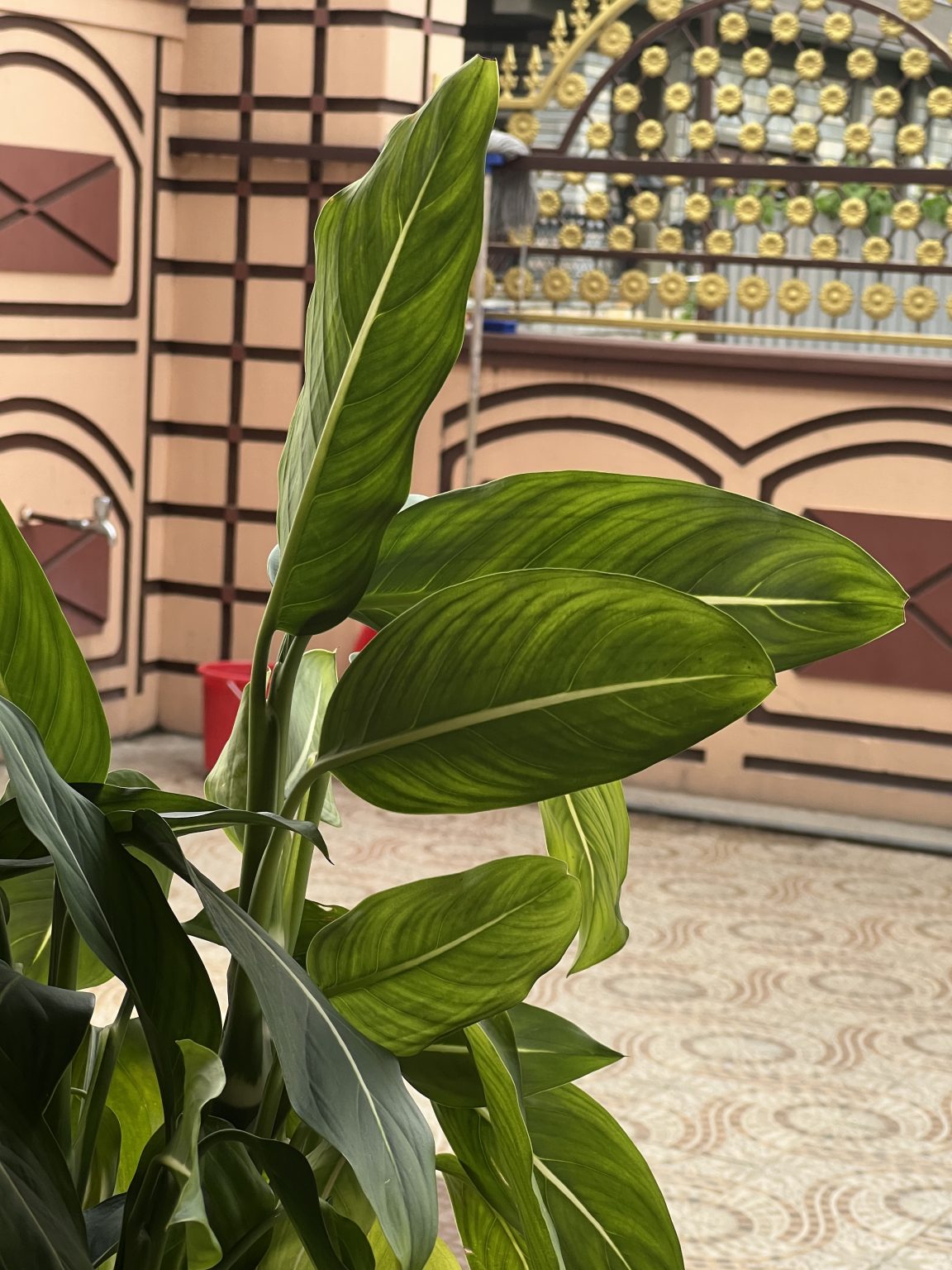 Alternative Text: A close-up view of green, glossy leaves with prominent white veins, showcasing a vibrant indoor plant.