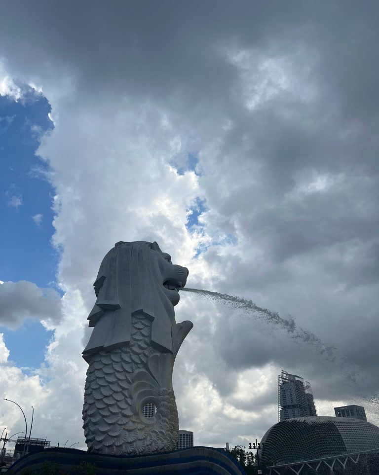 Alternative Text: The Merlion statue in Singapore, a white half-lion, half-fish figure, is shown from a low angle spouting a stream of water from its mouth against a dramatic sky filled with large dark grey and white clouds.