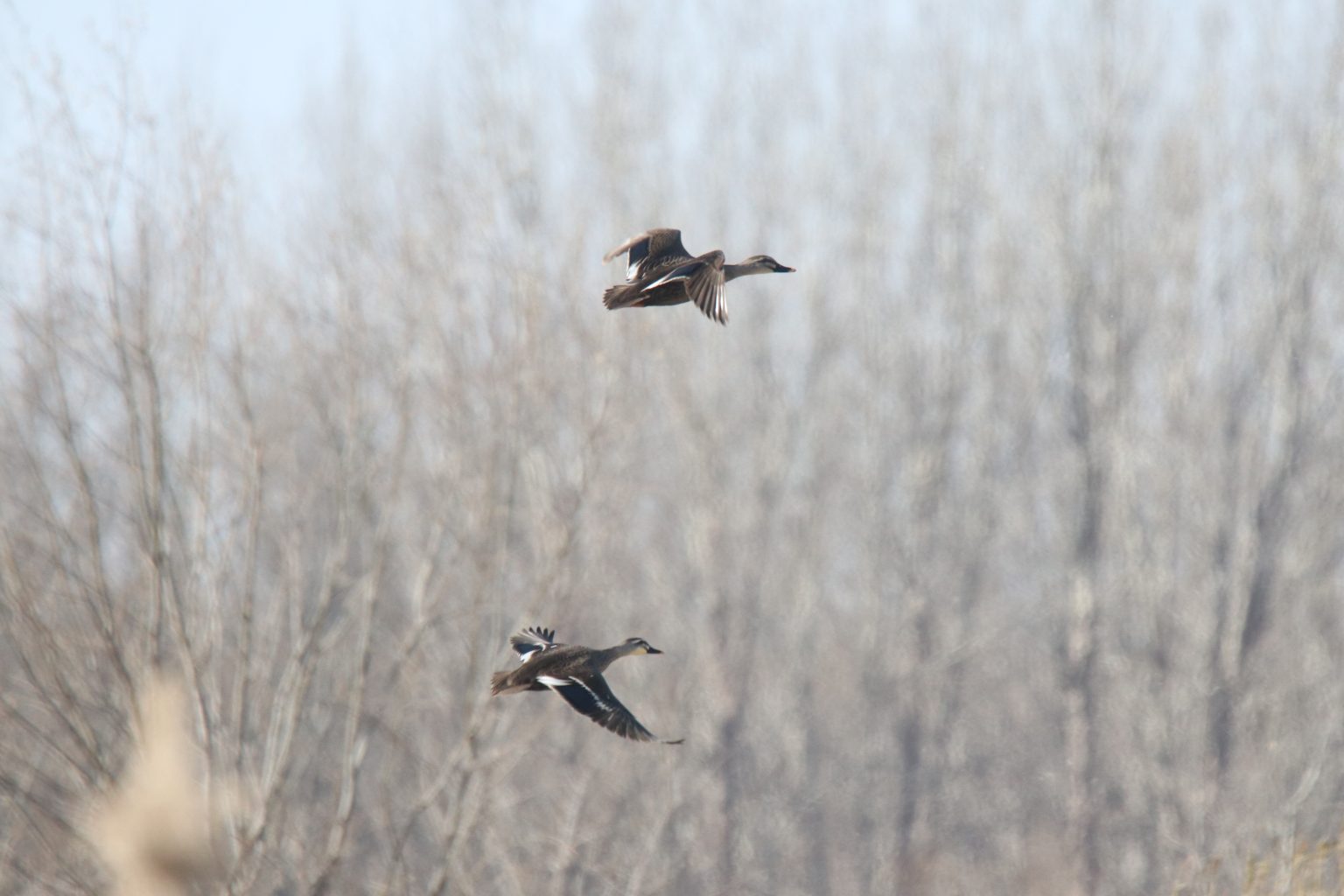 Alternative Text: Two Eastern Spot-billed Ducks in flight against a blurred background of bare, grey-brown trees. The photograph was taken in Zhangzehu National Urban Wetland Park, Changzhi City, China.