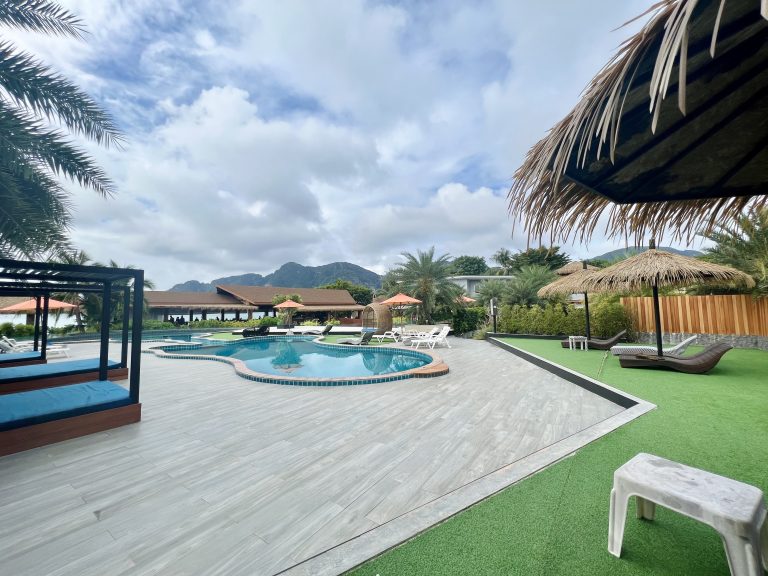 Alternative Text: A view of a resort area featuring several swimming pools surrounded by palm trees and lounge chairs. The area has a modern aesthetic with wooden decking and grass-like flooring. Thatched-roof umbrellas provide shade over some seating areas. In the background, mountains can be seen under a partly cloudy sky.