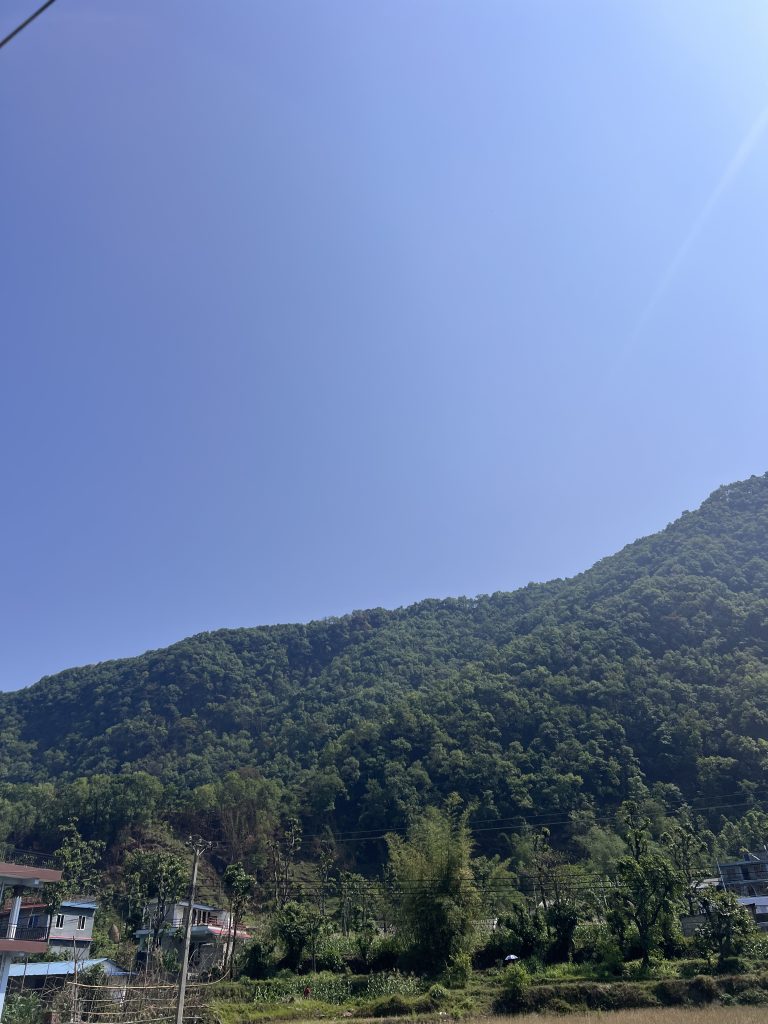 Alternative Text: A clear blue sky is visible above a lush green mountain landscape. The lower portion of the image features a few buildings, likely residential, surrounded by trees and vegetation.