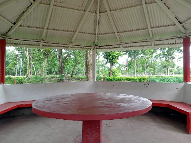 Alternative Text: An open pavilion with a circular red table at its center, surrounded by two red benches. The structure has a corrugated metal roof supported by white beams. Through the open sides, lush greenery and trees are visible in the background