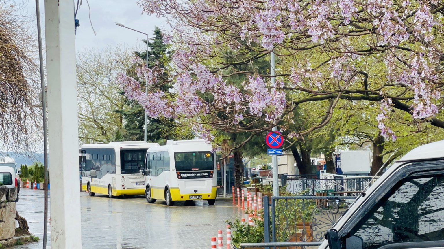 Alternative Text: Golyazi, Bursa, Turkey. Two buses parked at the local bus station. Surrounded by green trees and vibrant flowers.