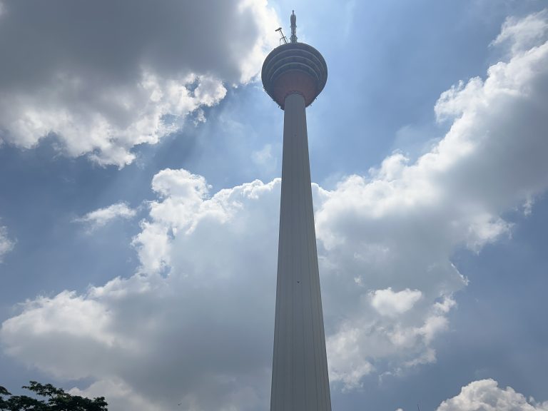 Alternative Text: A low-angle shot of KL tower reaching toward a bright sky with large white clouds.