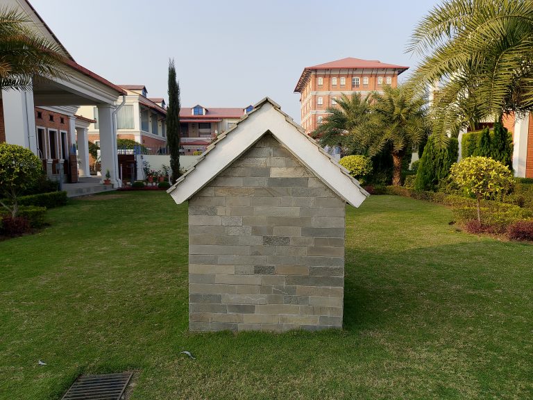 Alternative Text: A small, stone-clad house with a peaked roof situated in a well-maintained green lawn. In the background, there are larger buildings and several palm trees. The scene is bright and clear, suggesting a peaceful outdoor environment.