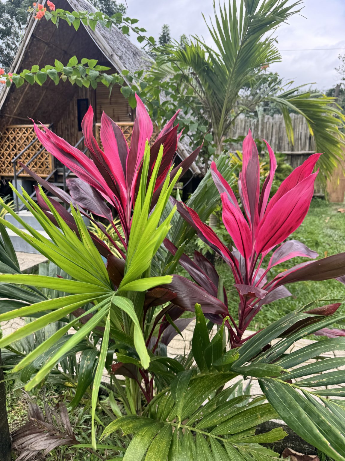 Alternative Text: A lush garden scene featuring vibrant tropical plants with striking red and green foliage in the foreground.