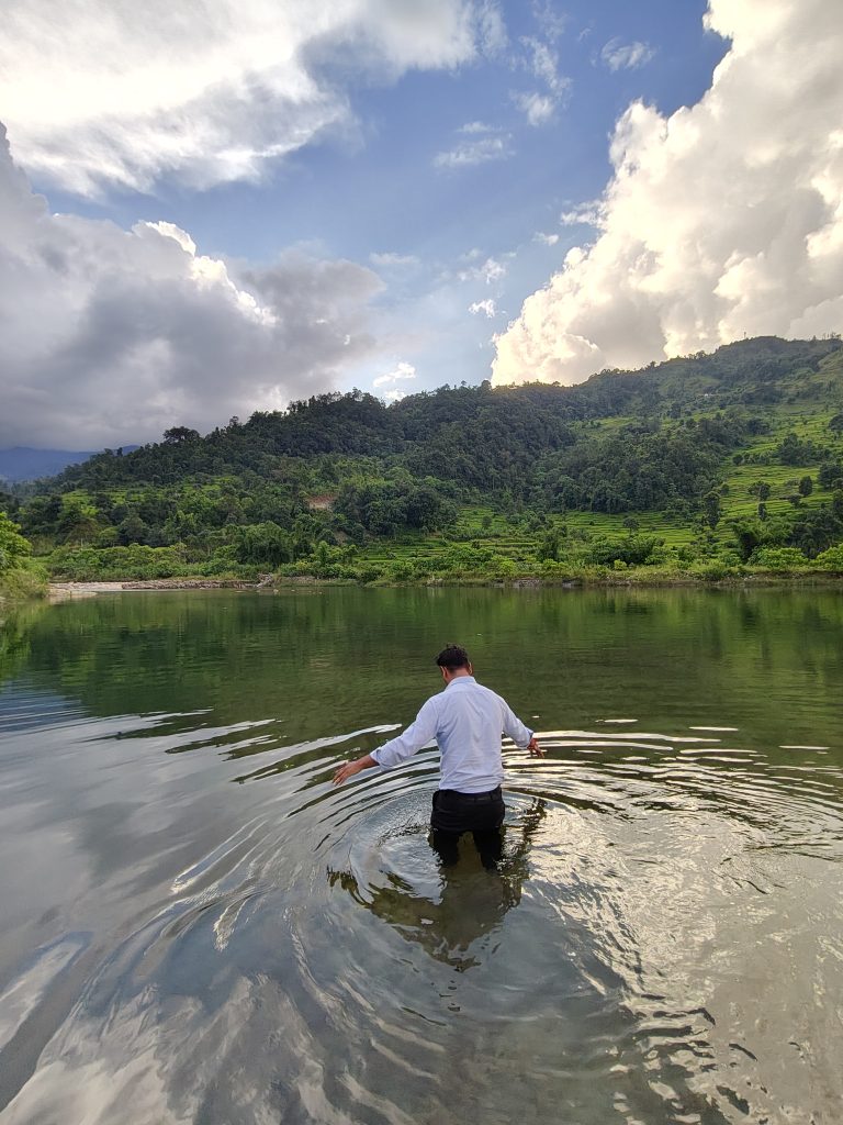 Alternative Text: A person wades into a serene body of water, surrounded by lush green hills and a blue sky with scattered clouds