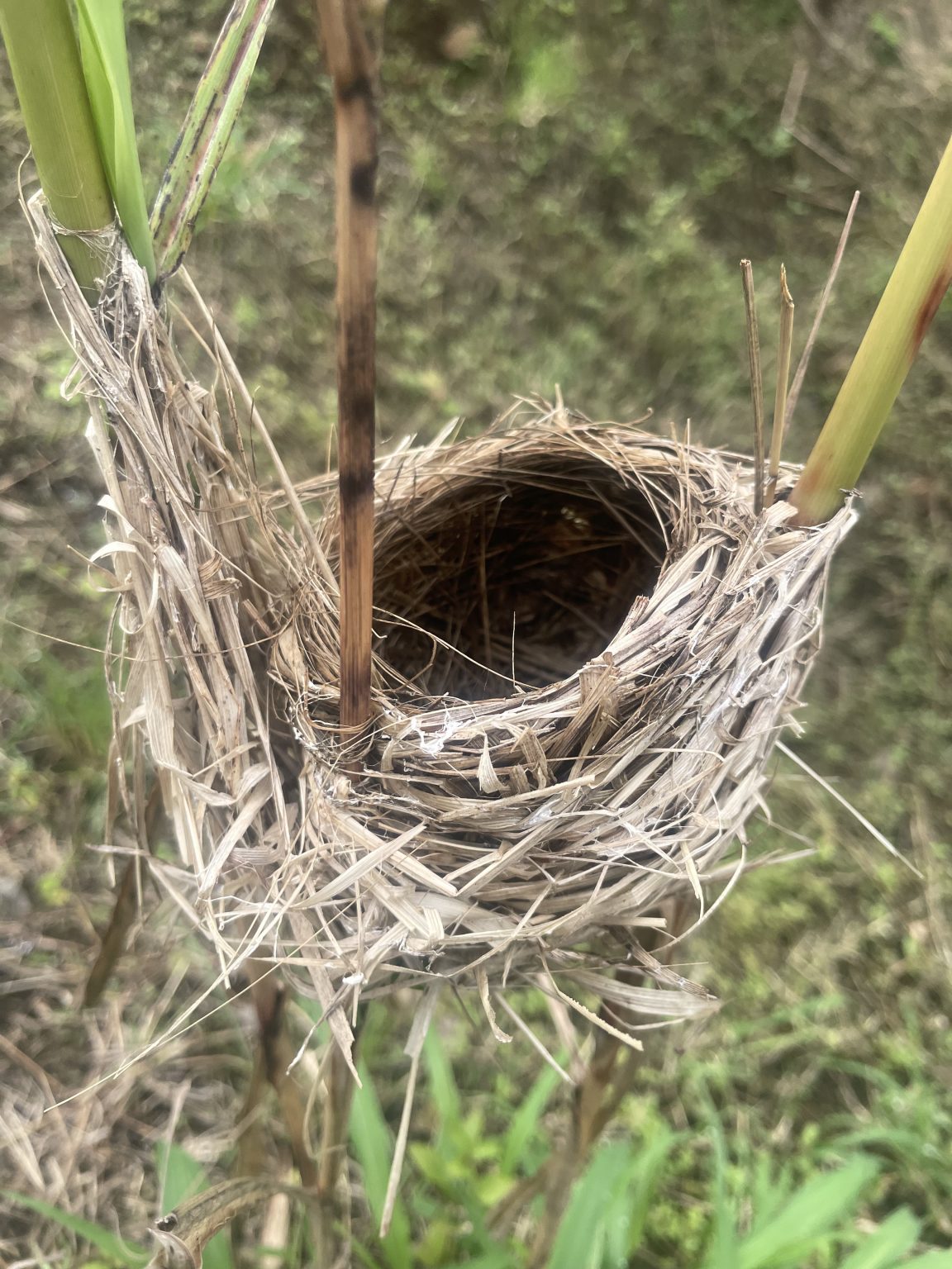 Alternative Text: A close-up image of a bird’s nest made from grass and twigs, nestled between green grass.