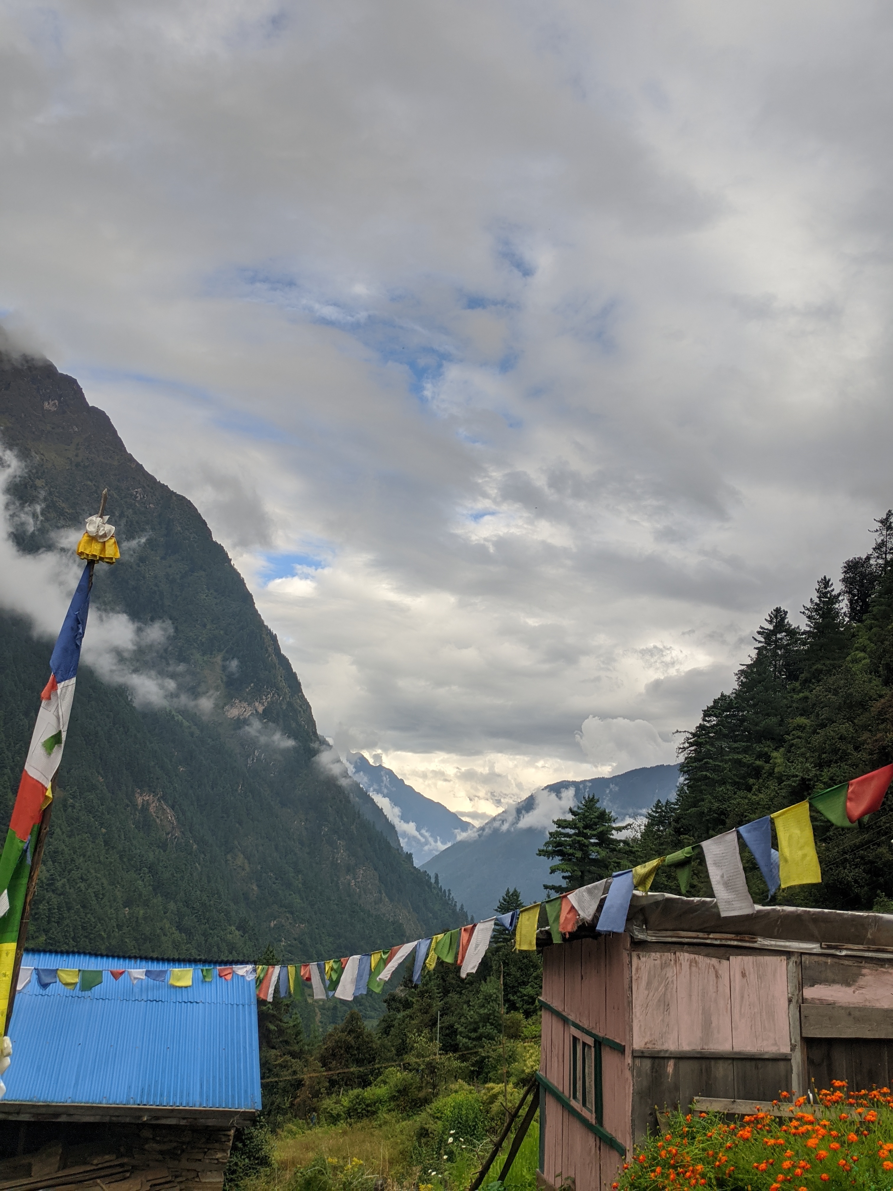 Alternative Text: A mountainous landscape under overcast skies, featuring a traditional building with a pink exterior and a blue roof.