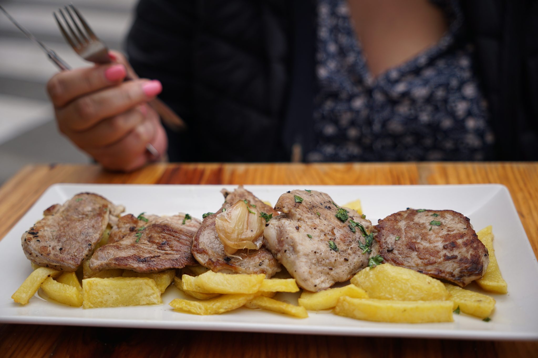 Alternative Text: A plate of grilled meat and fried potatoes garnished with herbs (solomillo al whisky), with a person holding a fork and knife in the background.