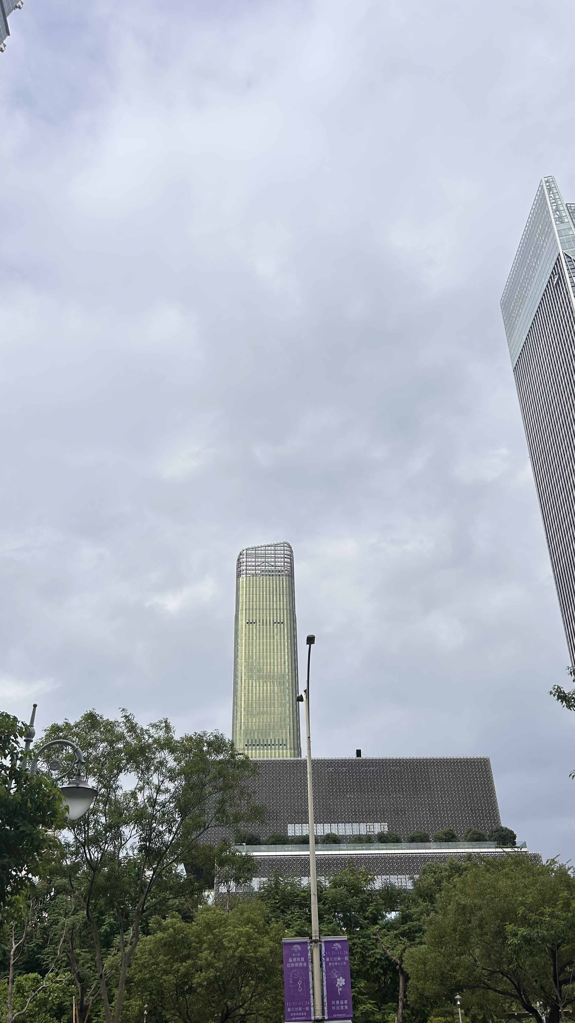 Alternative Text: A tall, modern skyscraper stands prominently against a backdrop ofovercast skies.