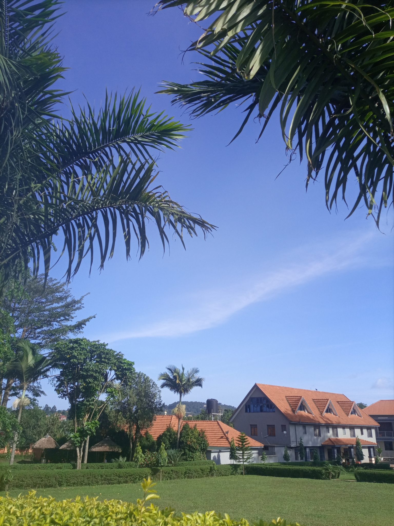 Alternative Text: Lush green landscape with tall palm trees. Two houses with orange roofs sit among neat greenery under a clear blue sky.