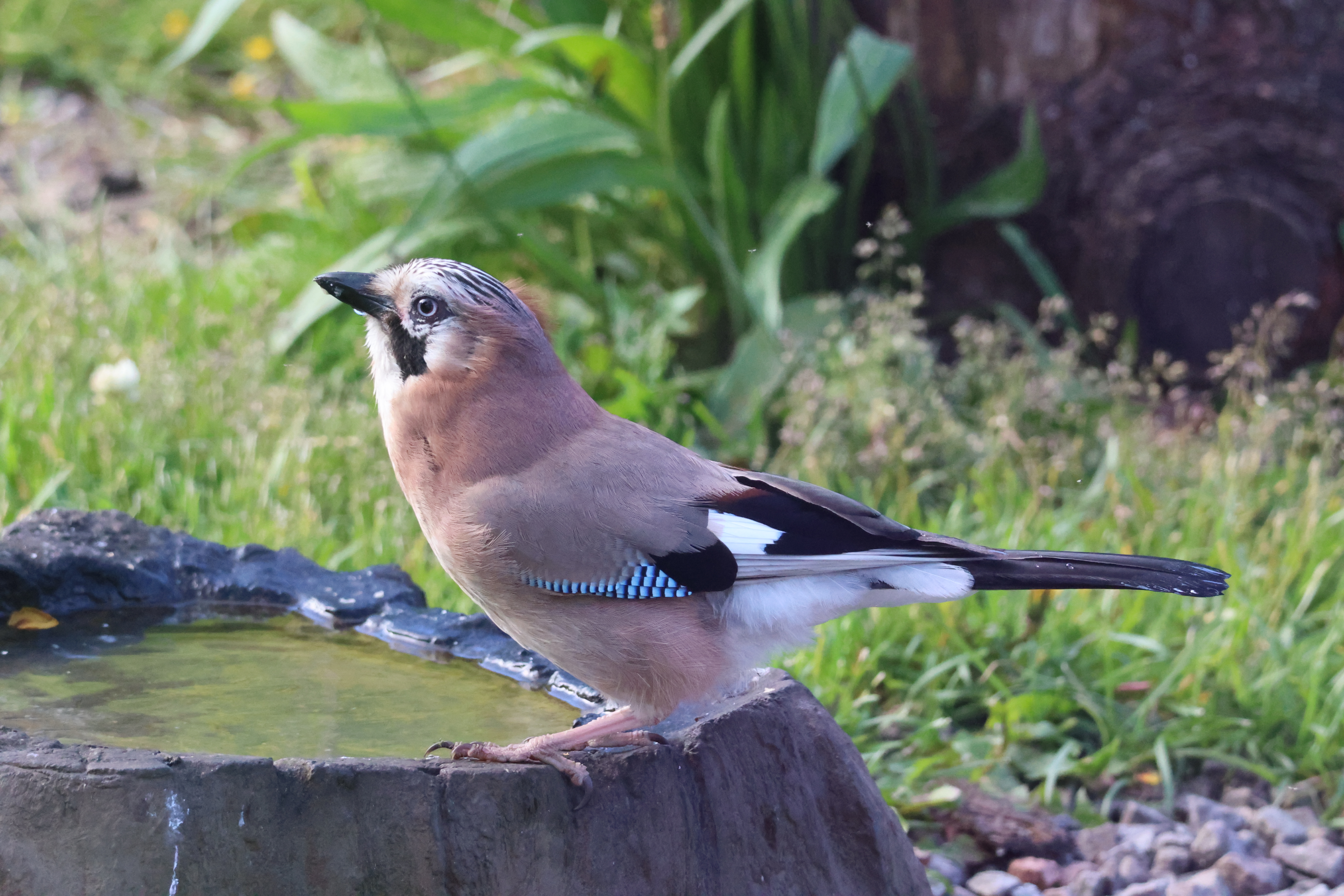 Alternative Text: A Jay (Garrulus glandarius) stands on a log-style water station among grass and foliage, a droplet of water hanging from its beak with its feathers shown in sharp detail.