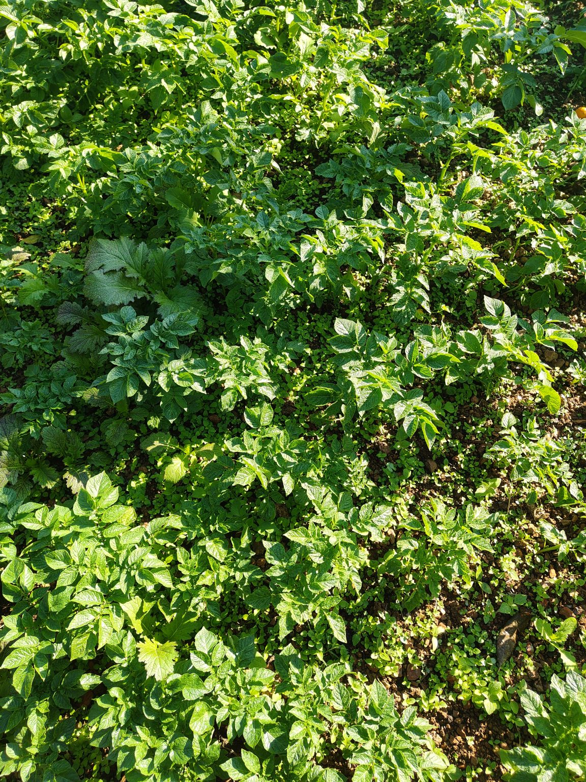Alternative Text: A dense patch of lush green plants, primarily consisting of potato foliage, interspersed with various other small green plants and weeds.