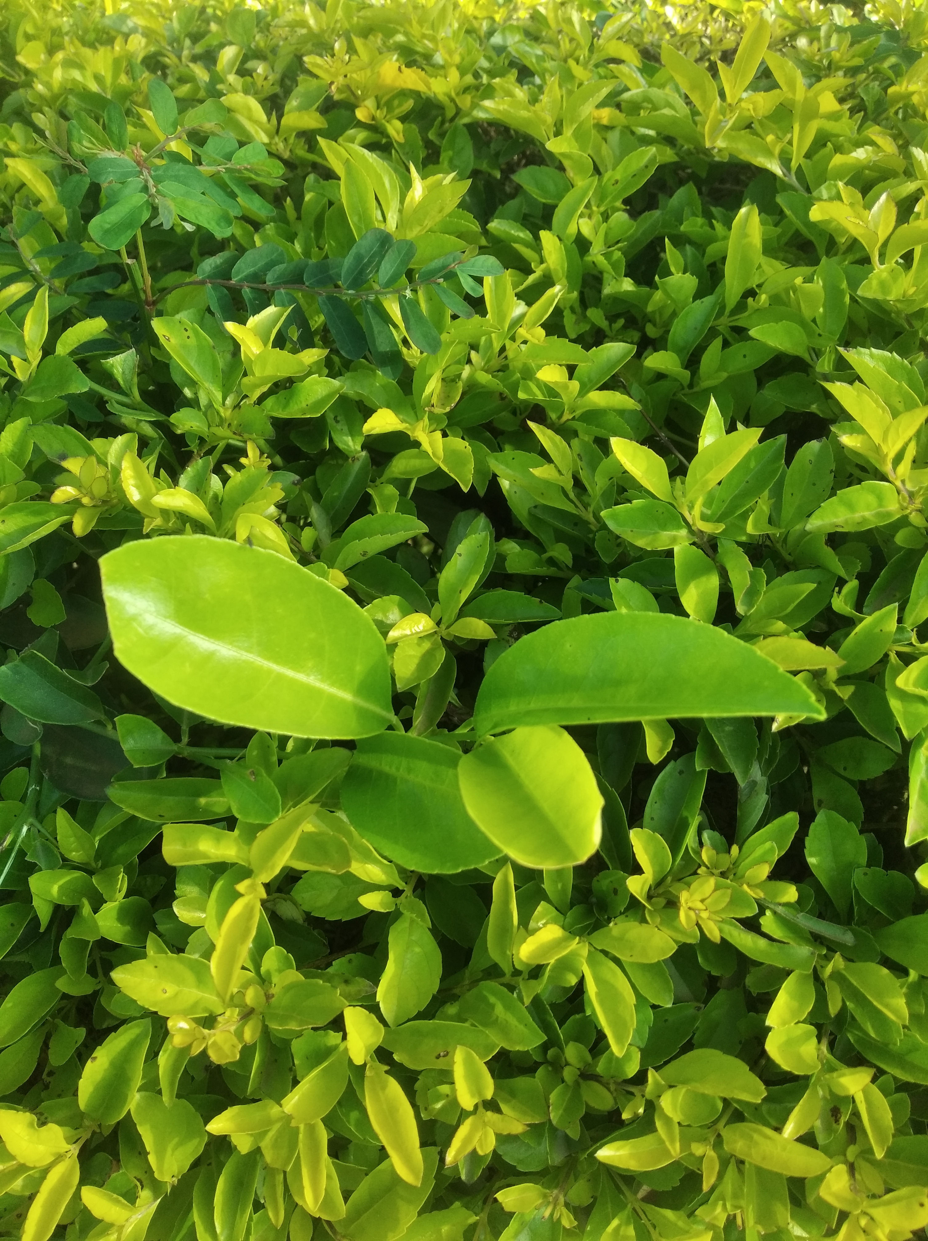 Alternative Text: A close-up view of lush green foliage featuring various shades of green leaves, including shiny, broad, and slender ones.
