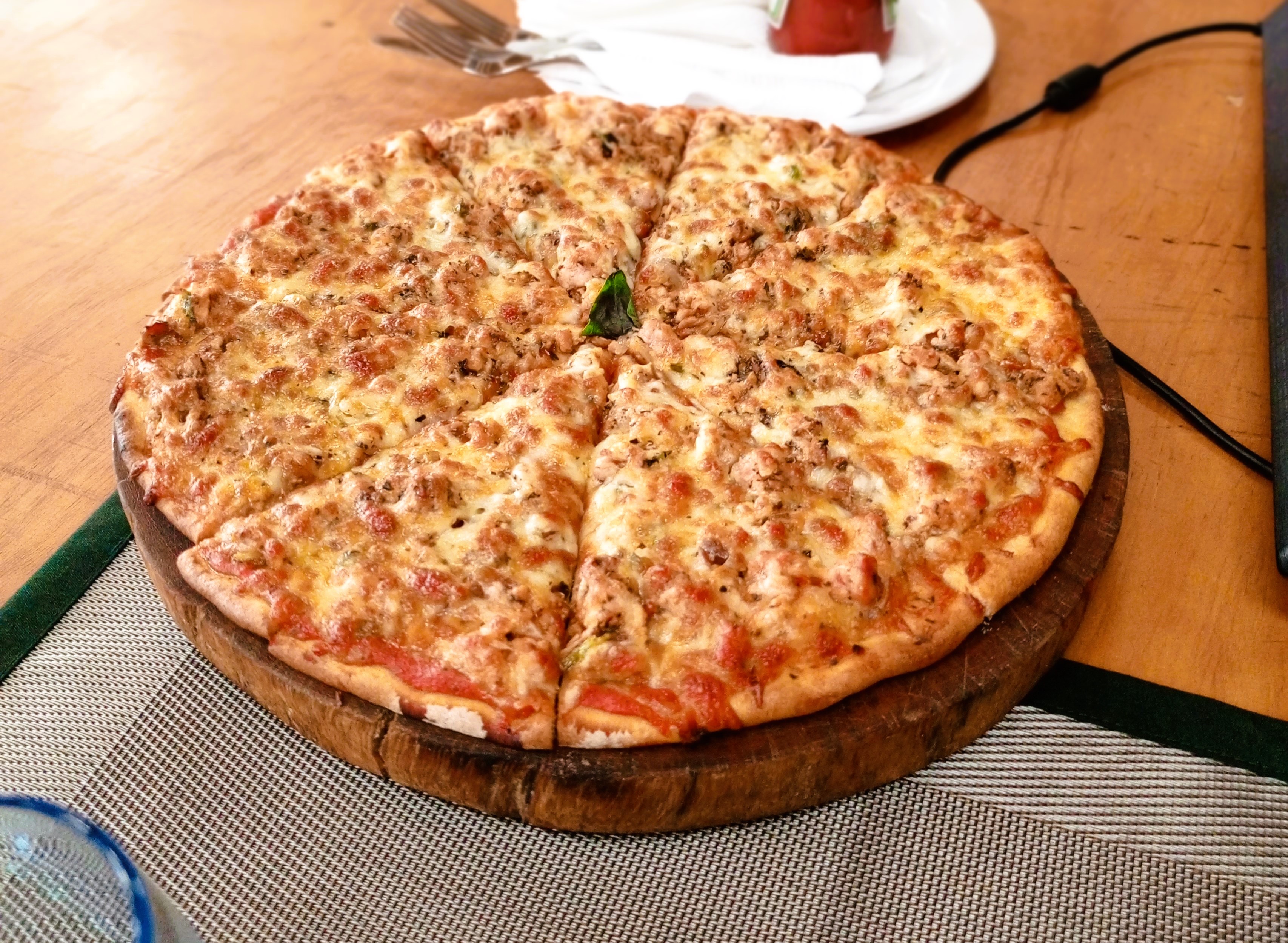 Alternative Text: A thick crust meat lovers pizza with melted cheese and ground meat, sliced into eight and served on a wooden board, topped with a basil leaf on a light wooden table.