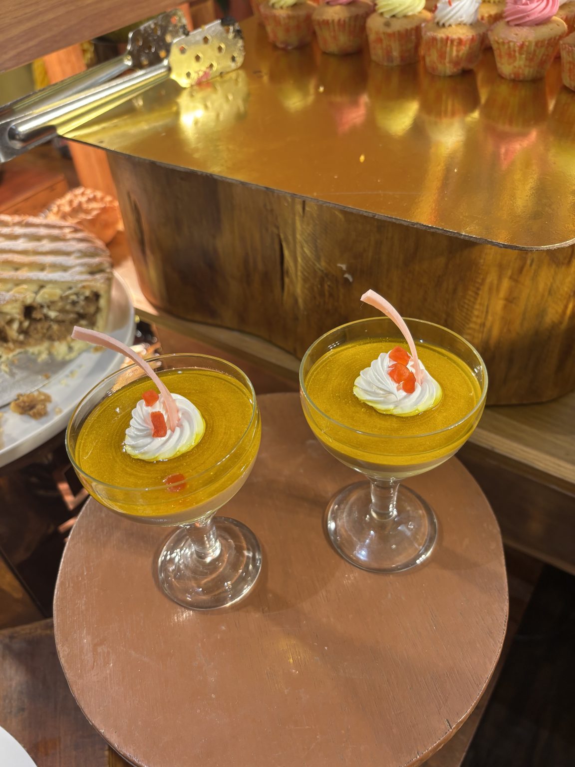 Alternative Text: Two elegant dessert cups filled with a golden yellow creamy dessert, each topped with a swirl of whipped cream and a small red decoration.