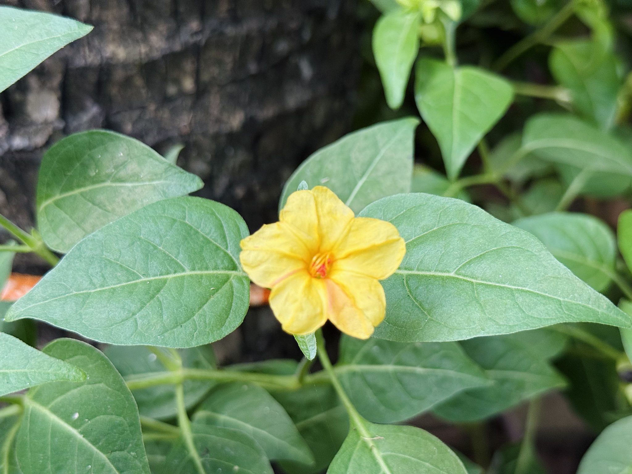 Alternative Text: A bright yellow flower with delicate petals and an orange center, surrounded by green leaves against a dark background.