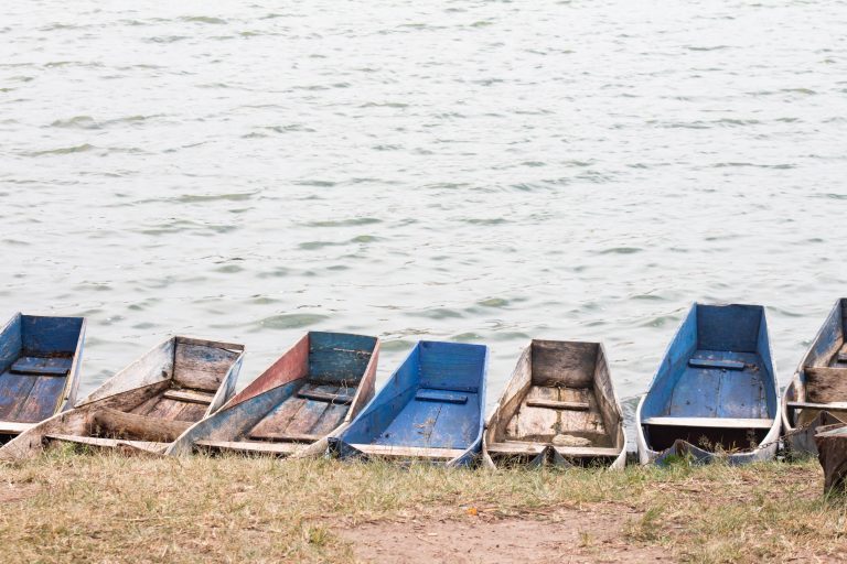Alternative Text: A row of small, fishing boats boats in various shades of blue and red, partially resting on a grassy bank next to a calm body of water