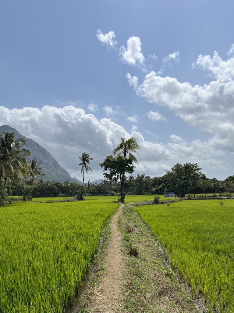 Alternative Text: A scenic view of a path winding through vibrant green rice fields, with a clear blue sky dotted with fluffy clouds above.