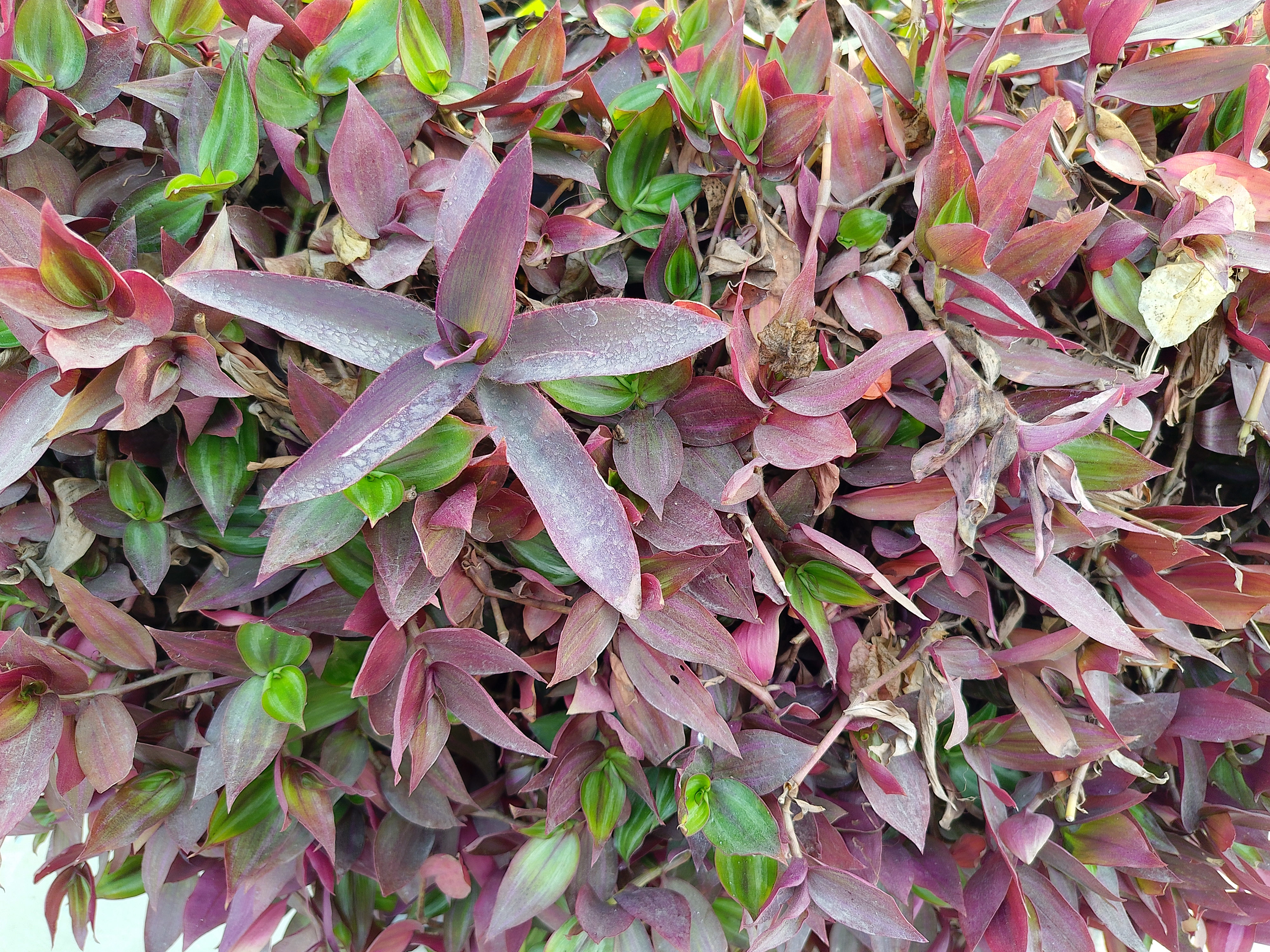 Alternative Text: A dense arrangement of vibrant green and reddish-purple leaves, showcasing various shapes and sizes.