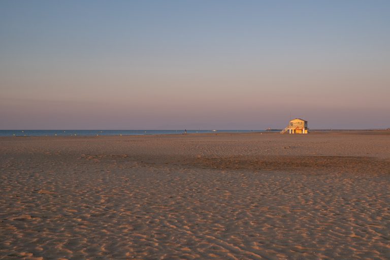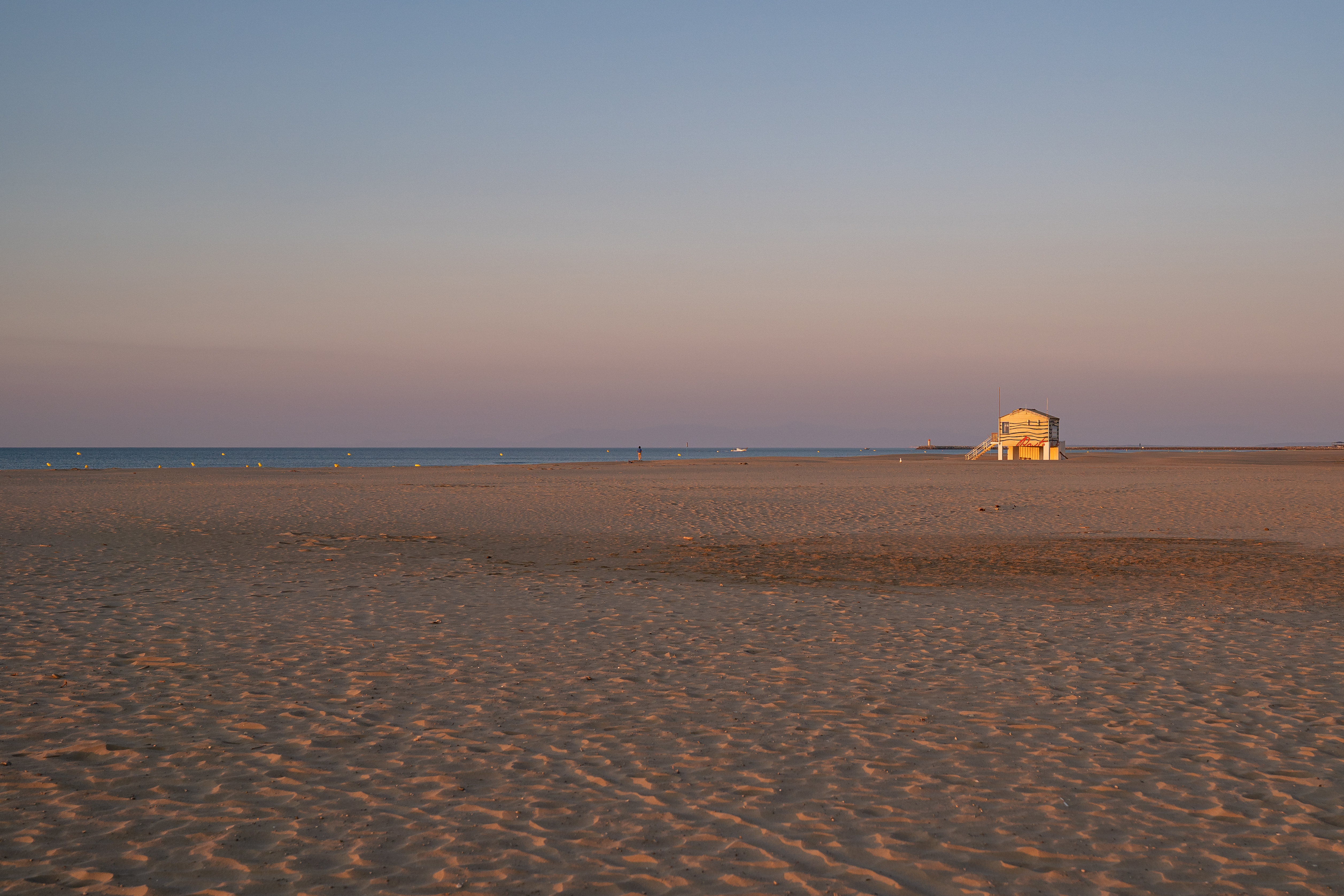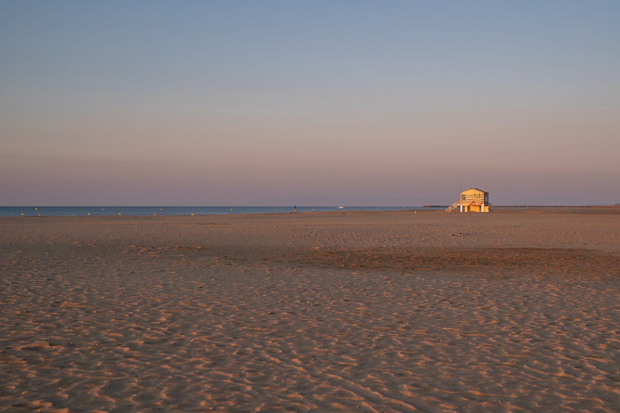 Alternative Text: The lifeguard house on Gruissan beach in soft morning light – a lone silhouette, calm and quiet.