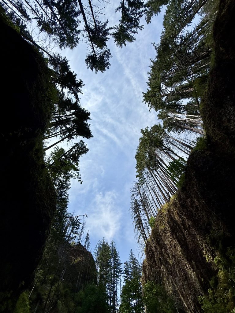 Alternative Text: Looking up through the forested canyon walls toward a clear blue sky framed by tall trees. Taken at Columbia River Gorge National Scenic Area, Oregon.