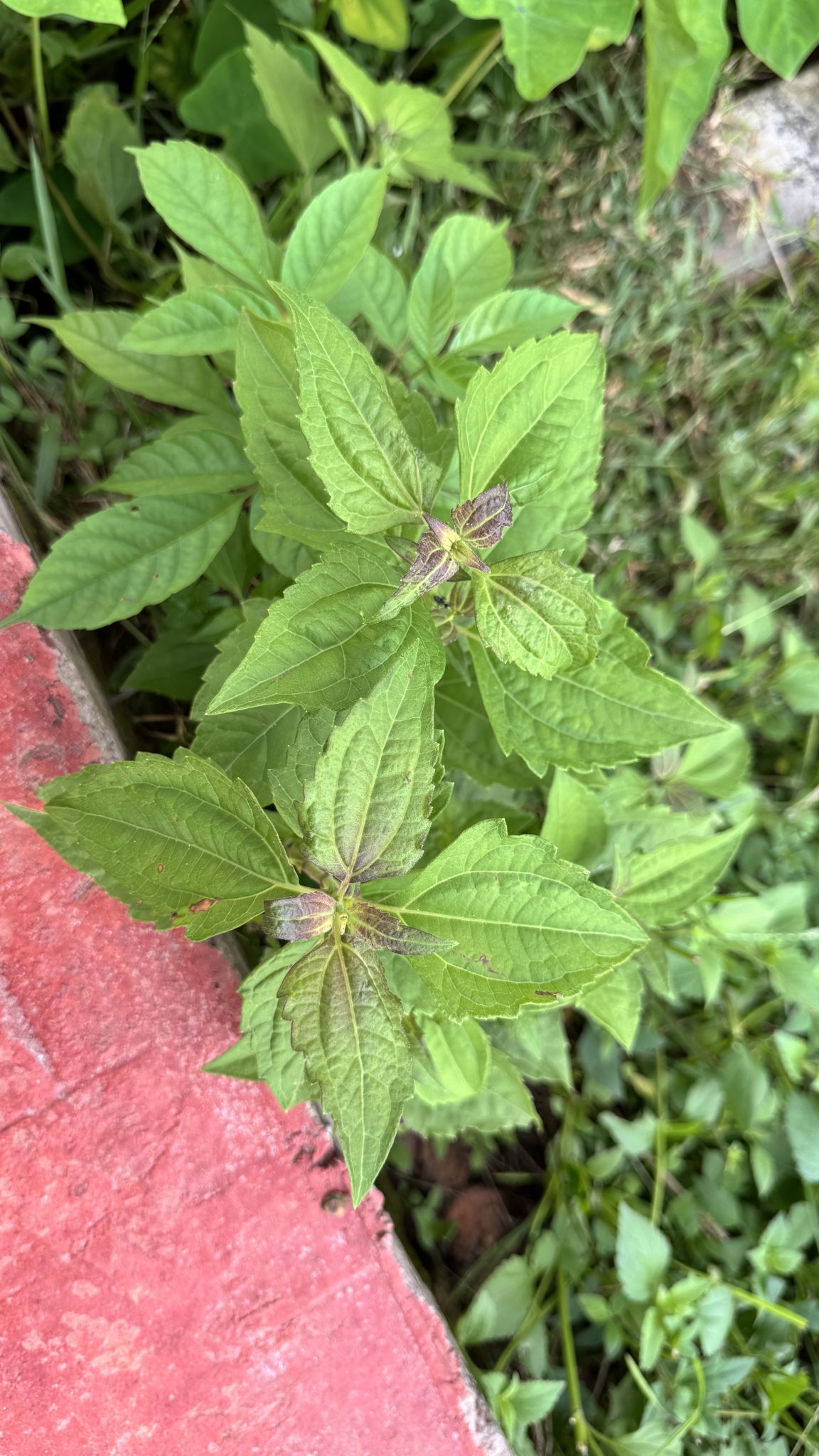 Alternative Text: A small, leafy green plant with a purplish tinge on its newest leaves grows beside a rough, red painted curb.