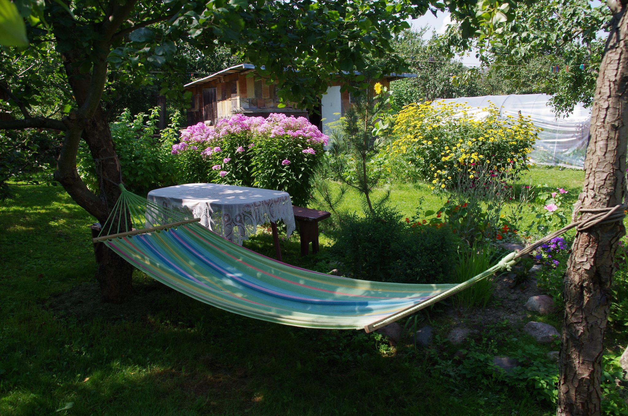 Alternative Text: Hammock strung between two trees in a garden, with a small table nearby and blooming flowers around