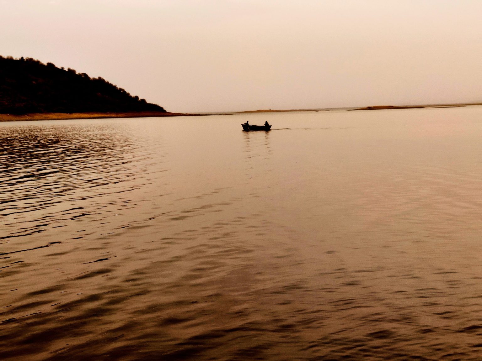 Alternative Text: Two people row a boat in calm waters near a beach with hillside, at sunset under an orange-brown hue, possibly due to smog.