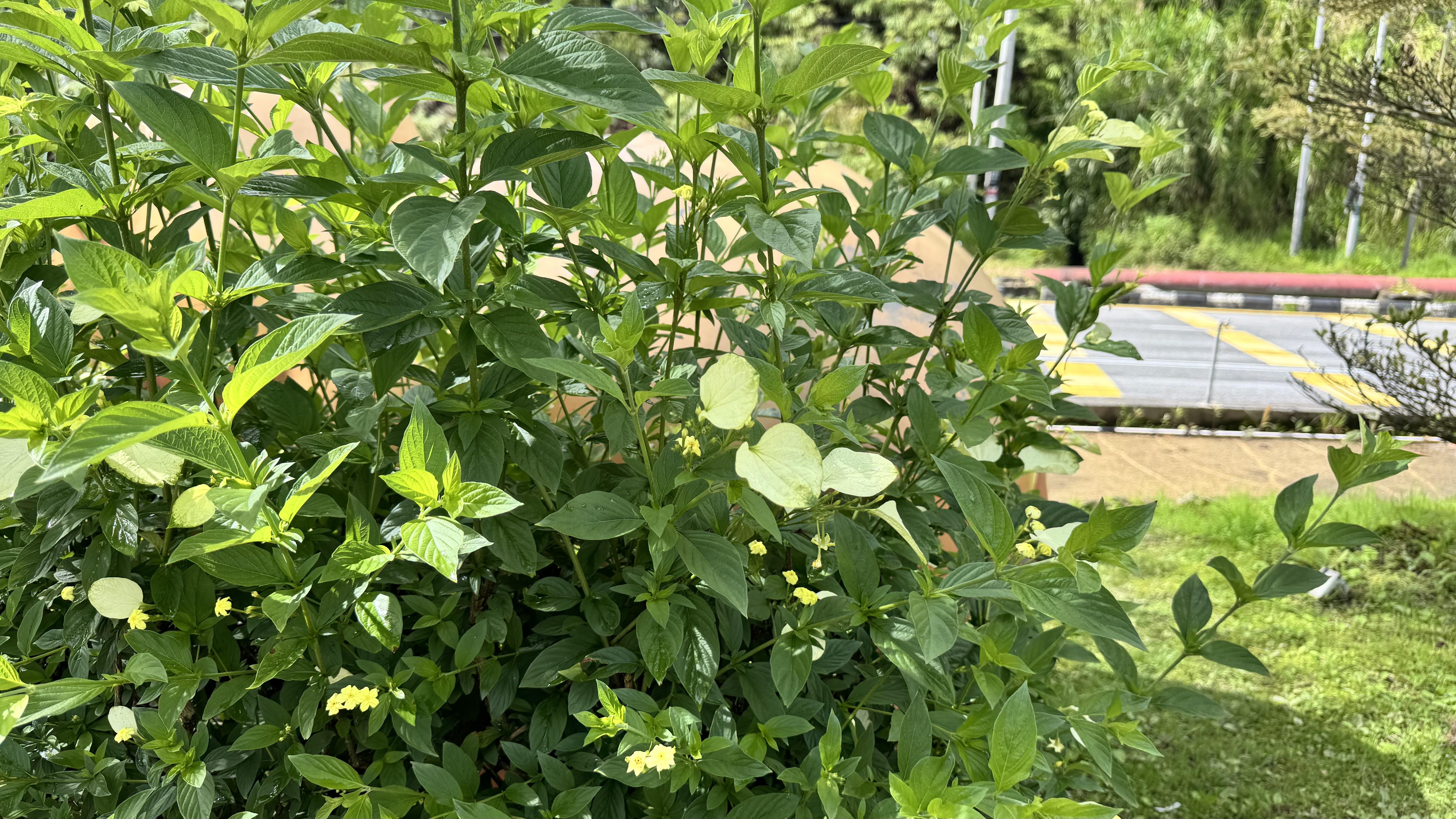 Alternative Text: A bush adorned with green leaves and blooming flowers is positioned in front of a road, enhancing the scenery.