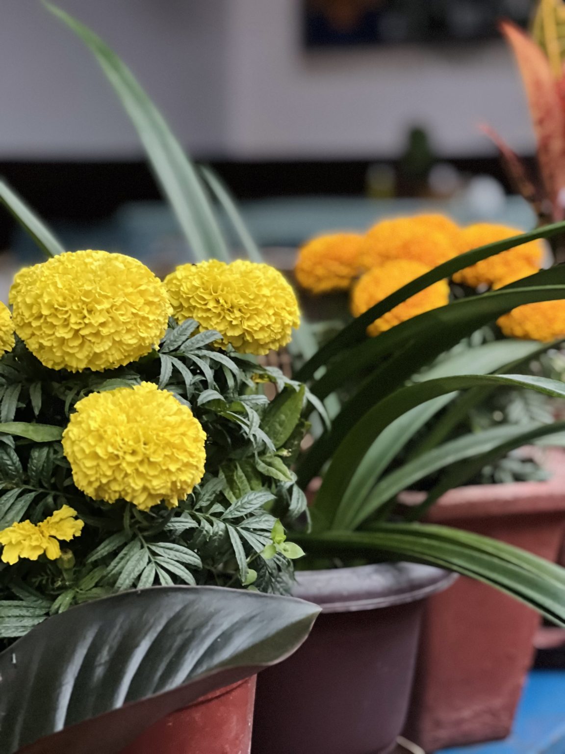 Alternative Text: A close-up of vibrant yellow marigolds among green leaves.