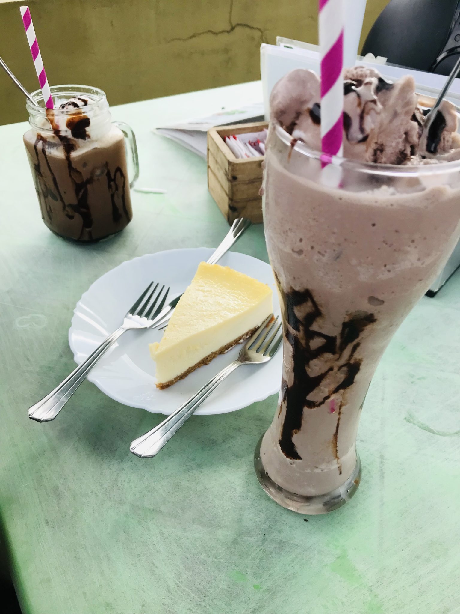 Alternative Text: On a white plate, there is a slice of cheese pastry accompanied by spoons, and on the table, there are two chilled chocolate beverages.