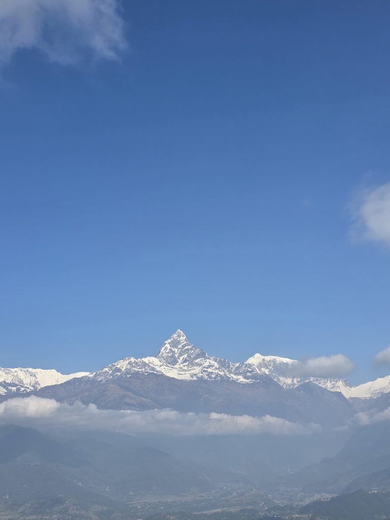 Alternative Text: A panoramic view of a majestic snow-capped mountain range under a clear blue sky, with some wispy clouds appearing in the upper corners